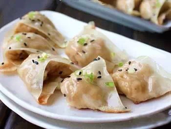 原料: 肉餡100克、餛飩皮100克、菠蘿、雞蛋1個、姜、番茄醬、糖、白醋、料酒、鹽、油。 做法: 1. 在肉餡中加入姜末, 胡椒粉, 鹽,料酒和1個雞蛋,順著一個方向攪 拌上勁,腌制5分鐘。 2. 將適量的肉餡放入餛飩皮的底部,向上折疊起來,將兩頭扭一下,中間粘點水,按壓緊,包好。 3. 鍋中燒熱油, 下入包好的餛飩炸至金黃色后撈出。 4. 鍋中放入少量的油,放入適量的番茄醬,翻炒一下,再加入點糖、白醋和鹽調味,下入炸好的餛飩,讓番茄醬均勻的裹在餛飩表面。 5. 在盤底部鋪上些菠蘿片,中間放上餛飩,點綴一下即可。 【生煎餛飩】