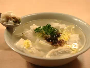 原料: 肉餡、雞蛋、餛飩皮、芝麻醬、姜、小蔥、淀粉、蝦皮、蠔油、紅椒油、醬油、醋、鹽。 做法: 1. 肉餡中加入雞蛋、胡椒粉、姜末、淀粉、胡椒粉、蠔油和鹽等調味料,順著一個方向攪拌均勻, 腌制10分鐘。 2. 將適量的肉餡放入餛飩皮的底部中間,向上折疊兩下,折疊成條狀后將兩端折在一起,用手指將兩端按壓連接,包好。 3. 芝麻醬加入適量的開水和少量的橄欖油懈開。 4. 水開后下入包好的餛飩,餛飩全部浮起后再煮上半分鐘撈出,放入碗中,加上準備好的醬油、醋等調味料即可。